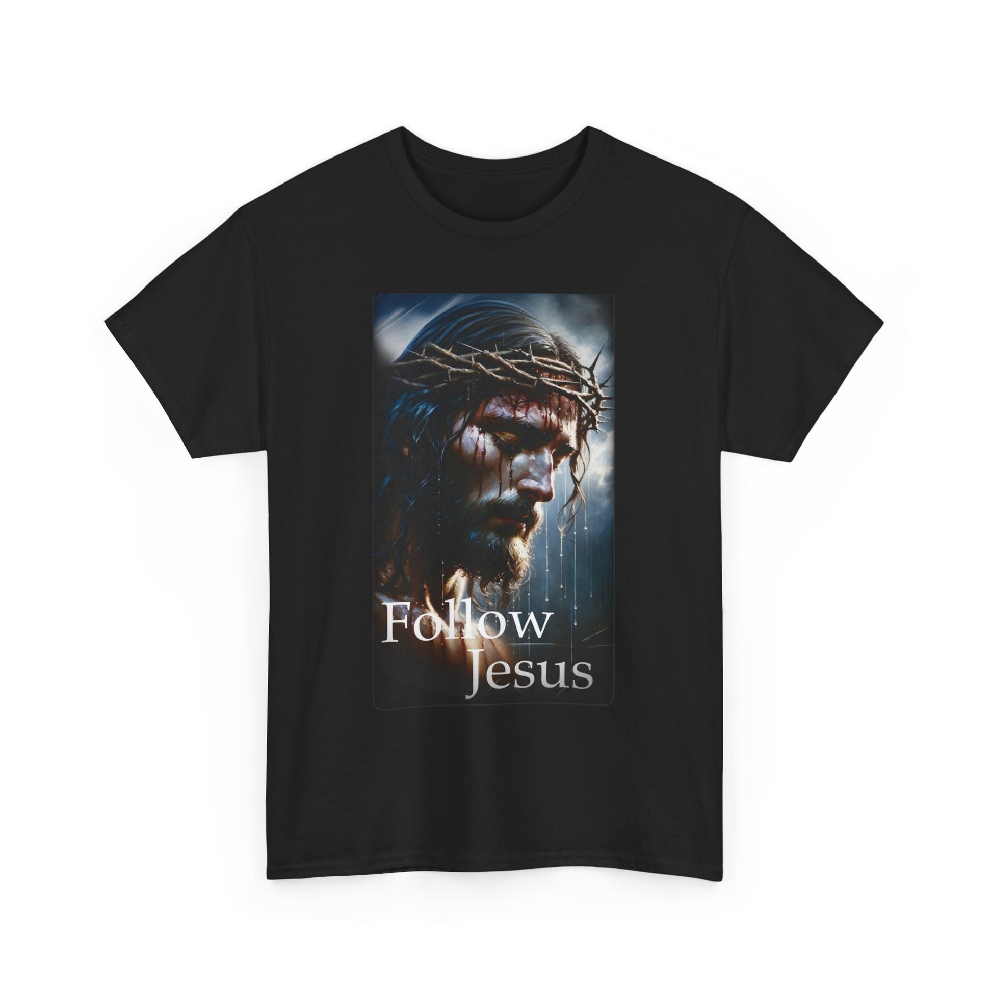 A Christian themed T-Shirt with the message 'Follow Jesus'. Perfect for those who want to express their faith through their clothing. This tee gives off a positive and spiritual vibe, making it an ideal addition to a believer's wardrobe. Relevant for religious holidays and everyday wear.